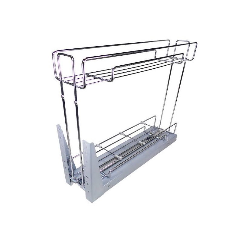 Produto confeccionado em aço cromado, acompanha trilhos telescópicos zincados, que vão montados na peça. O carrinho estrutural é todo soldado e pintado na cor cinza.