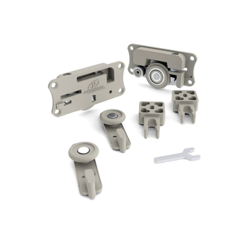 Sistema com molas exclusivas e modernas que impedem o descarrilamento das portas. Possui trava frontal que quando movimentada tem função de acionamento ou travamento das molas. Com mola 4025.